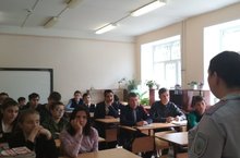 Перед учителями и учащимися школы выступила инспектор ОП №10 "Промышленный" Вафина Наиля Рифкатовна. Тема её выступления "Безопасность. Профилактика правонарушений в летний период".