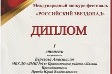 Поздравляем Березову Настю, ученицу 8 класса, с получением диплома 1 степени в Международном конкурсе-фестивале "Российский звездопад".