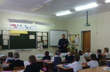 Перед учащимися начальных классов выступил капитан полиции ОГИБДД Самойлов Евгений Александрович. Он призвал ребят быть внимательными на дорогах в период осенних каникул.