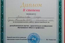 Поздравляем ученицу 4б класса Хакимову Саиду (руководитель Алексеева Т.Н.) за диплом II степени в республиканской научно-практической конференции обучающихся "Шаги в профессию", которая прошла 21 апреля .