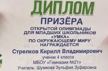 Ученик 4 В класса Стрелков Кирилл стал призёром олимпиады Умка по окружающему миру. Поздравляем Кирилла и Зульфию Зуфаровну, классного руководителя с победой и желаем дальнейших успехов!