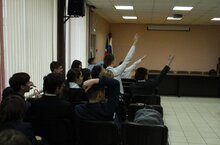 Ученики 9"В" ходили ко 2"В", они играли в игру с шариком. А именно, нужно было удержать воздушный шарик в ногах, прыгая на листочки, которые лежали в разном расположении.