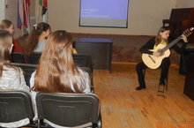 Вчера у учащихся девятых классов состоялась встреча с молодой гитаристкой, студенткой четвертого курса народного отделения казанского музыкального училища имени И.В. Аухадеева Анной Одинцовой. Встреча, организованная психологом школы, проходила в рамках изучения курса «Твое профессиональное призвание» и была посвящена профессиям типа «Человек – художественный образ», т.е . творческим профессиям. Гостья исполнила произведения на гитаре, продемонстрировала видеоролики с выступлениями студенческих оркестров училища , рассказала историю своего учебного заведения, познакомила с особенностями учебы в музыкальном училище.