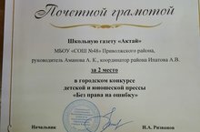 Поздравляем редакцию школьной газеты "Актай" и Аманову Айсару Кантаевну со 2 местом в городском конкурсе детской и юношеской прессы "Без права на ошибку". Желаем творческих успехов и новых побед!