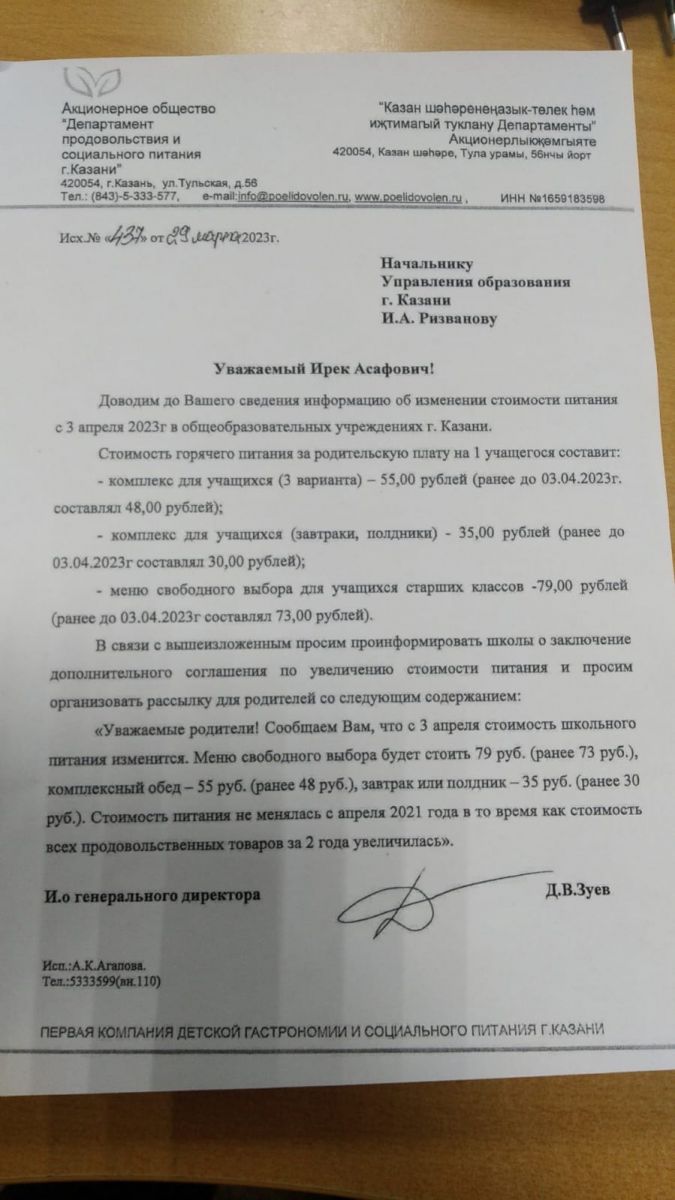 Услуги по организации питания в общеобразовательном учреждении предоставляет АО «Департамент продовольствия и социального питания г.Казани» (далее – Департамент) на основании договора, заключенного между образовательным учреждением и Департаментом. Ссылка на сайт Департамента poelidovolen.ru