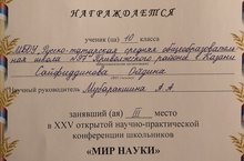 Ученица 10 класса Сайфиддинова Ойдина под руководством своего педагога Мубаракшиной А.А. заняла 3 место в XXV открытой научно-практической конференции школьников "Мир науки" в секции Романо-германская филология. Поздравляем!