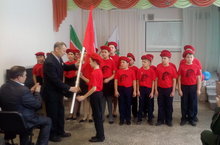 Начальник штаба юнрамии по Вахитовскому и Приволжскому районов Хабибуллин Р.Р. в торжественной обстантвке вручил флаг юнрамейцам нашей школы.