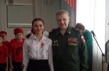 Ученица 9 класс , член Юнармейского отряда " сокол" Тимербаева Регина награждена медалью 3 степени " За доблесть и отвагу" . медалью наградил генерал-майор Бородин А.И .