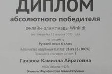 Поздравляем Гаязову Камиллу, ученицу 6 класса, с победой в онлайн-олимпиаде Winkid по русскому языку(абсолютный победитель). Руководитель: Ферафонтова А.И.