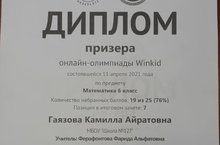 Поздравляем Гаязову Камиллу, ученицу 6 класса, с победой в онлайн-олимпиаде Winkid по математике. Руководитель: Ферафонтова Ф.А.