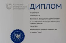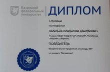 Поздравляем ученика 11 а класса Васильева Владислава с дипломом 1 степени победителя Межрегиональной предметной олимпиады КФУ по предмету "Математика", учитель Мухаметшина А.Ш.