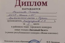 Поздравляем призера (3 место) районного этапа городского конкурса чтецов "Звёздный билет" в рамках республиканского конкурса "Живая классика" Ахметову Самину (предшколка). Учитель: Хайрутдинова Л. В.