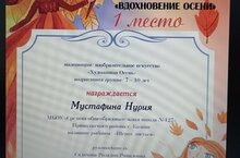 Поздравляем Мустафину Нурию с 1 местом в Республиканском конкурсе творческих работ "Вдохновение осени", руководитель Салахова Р.Р.