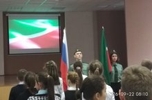 Каждый понедельник, утром, перед уроками проходит в школе церемония внесения флагов РФ и РТ, а также исполнение гимнов РФ и РТ.