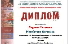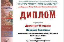 Поздравляем Киркину Ангелину с Дипломом 2 степени в Республиканском конкурсе литературного чтения "В мире литературных мыслей", руководитель Козина Р.У.