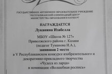 Поздравляем Луканину Изабеллу,занявшую 2 место в V Республиканском конкурсе изобразительного и декративно - прикладного творчества "Чудеса из ларца" руководитель Туманова И.А.