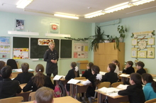 Тема выступления: «Безопасное поведение в пути следования в школу и обратно. Безопасное поведение на улице, в подъезде, в лифте, при общении с незнакомым человеком». Беседы проведены с учащимися 1-6 классов в количестве 217 человек, а также с педагогическим коллективом начальных классов – 8 классных руководителей.