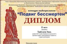 В рамках мероприятий, посвященных 70-летию Победы в Великой Отечественной войне, в целях вовлечения детей в творческую деятельность историко-патриотического направления, в празднование 70-летия Победы советского народа в Великой Отечественной войне 1941-1945 годов, 19 февраля 2015 года был организован и проведен конкурс видеороликов среди учащихся образовательных учреждений наши ребята заняли 2 место, руководитель Сташенко Юлия Михайловна.
