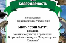 Благодраственным письмом была награждена наша школа за активное участие в проведеении Всероссийского конкурса "Мир вокруг нас. Хищники".