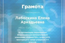 Ученики 1А класса приняли учатие в Всероссийкос математической олимпиаде "Клевер'ОК", который проводился осеню 2015. Дипломы получили все участники и благодарственное письмо координатору Лабоскиной Е.А.