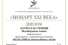 Ученики нашей музыкальной школы Амина Игамбердиева и Марк Ситнов выступили на VIII Международном конкурсе пианистов «Моцарт XXI века». По итогам соревнований оба юных музыканта были удостоены высокого звания лауреата II степени. Мы гордимся победой наших учеников и благодарим за профессионализм и труд их преподавателя - Елену Семеновну Сорокину. Поздравляем с заслуженным успехом и желаем новых побед!
