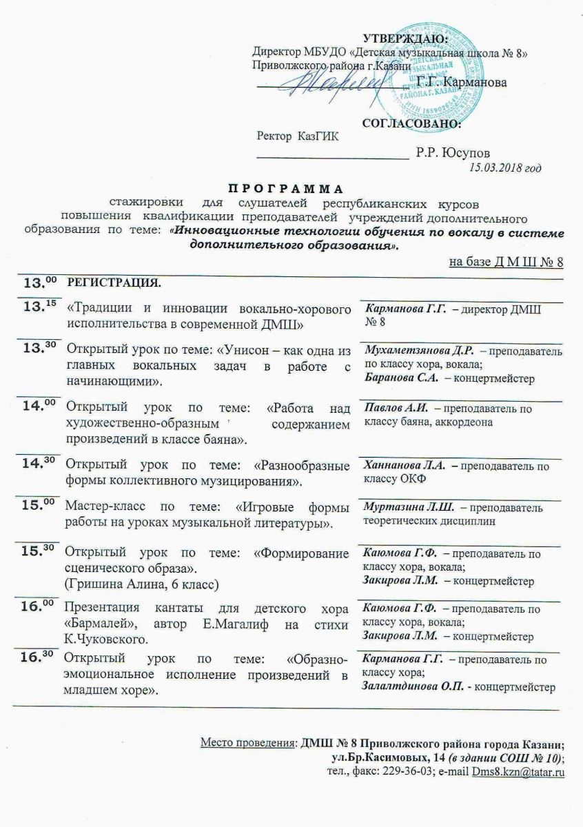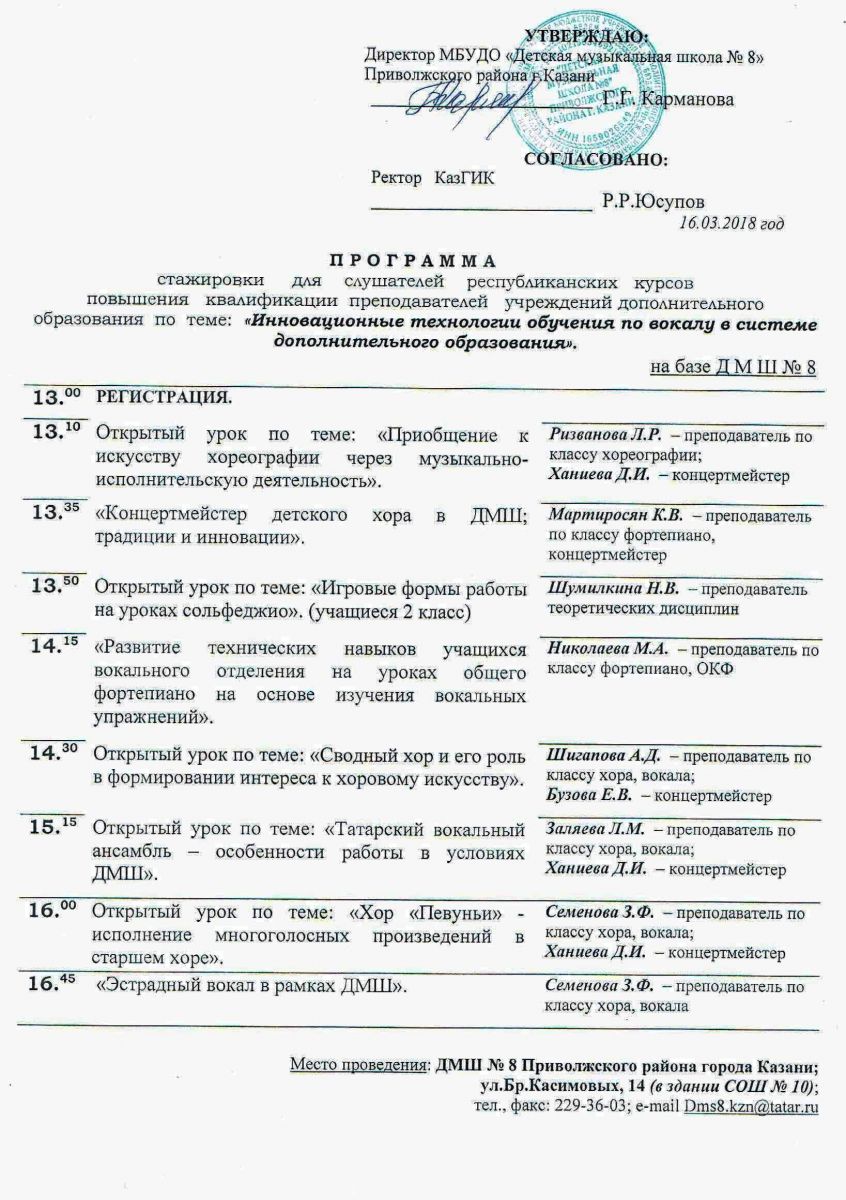 15 марта - стажировка для слушателей республиканских курсов повышения квалификации преподавателей учреждений дополнительного образования по теме: «Инновационные технологии обучения по вокалу в системе дополнительного образования». (на базе ДМШ № 8) Программа семинара https://edu.tatar.ru/priv/page2399.htm/page3596548.htm (см. фото)