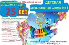 26 февраля 2016 года в 16.00 - Праздничный концерт в честь 25-летия ДМШ № 8. (Культурный центр МВД РТ, ДК Менжинского (ул. К.Маркса, 26)