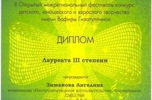 П о з д р а в л я е м призеров I Открытого межрегионального фестиваля-конкурса детского, юношеского и взрослого творчества имени Вафиры Гизатуллиной, посвященного 65-летию певицы - Зиманова Ангелина - Лауреат III степени. Преподаватель: Султанова Рамиля Ринатовна; - Шайхутдинова Гузель - Лауреат II степени. Преподаватель: Каримова Юлия Геннадьевна; - Эзеков Марат - Диплом I степени. Преподаватель: Малышева Лидия Николаевна.