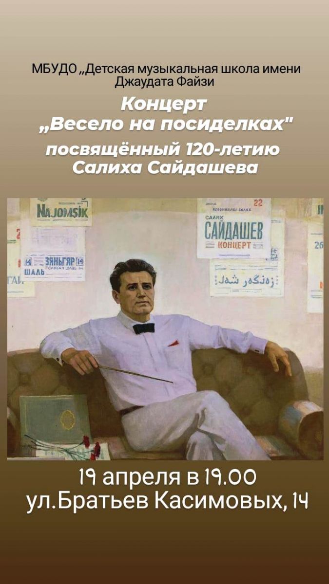 19.04 в 19.00 - на базе ДМШ имени Джаудата Файзи состоится концерт "Весело на посиделках", посвящённый 120-летию со дня рождения Салиха Замалетдиновича Сайдашева. В связи с особым санитарно-эпидемиологическим режимом, вход родителей на концерт ограничен: на один номер - один взрослый, наличие маски и бахил ОБЯЗАТЕЛЬНО! Афиша