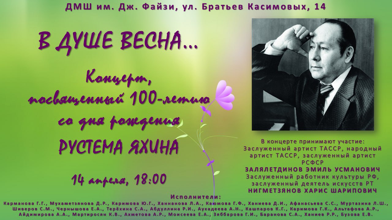 14.04 в 18.00 - на базе ДМШ имени Джаудата Файзи состоится КОНЦЕРТ, посвящённый 100-ЛЕТИЮ со дня рождения Рустема Яхина. В связи с особым санитарно-эпидемиологическим режимом, вход родителей на концерт ограничен: на один номер - один взрослый, наличие маски и бахил ОБЯЗАТЕЛЬНО! Афиша