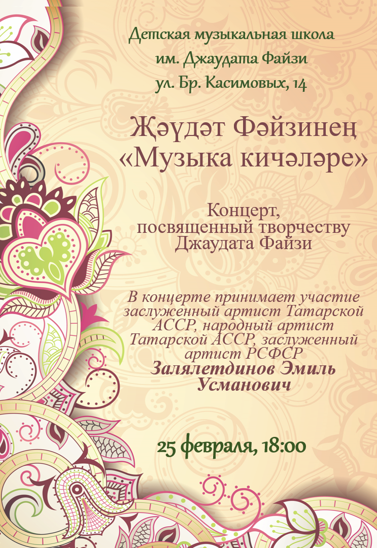 25.02.2021 г. в 18.00 на базе ДМШ имени Джаудата Файзи состоится КОНЦЕРТ - Җәүдәт Фәйзинең "Музыка кичәләре". В связи с особым санитарно-эпидемиологическим режимом, вход родителей на концерт ограничен: на один номер - один взрослый, наличие маски и бахил ОБЯЗАТЕЛЬНО!. Афиша. Видео ⇒ https://yadi.sk/d/Ms6v8zm_lWsaOQ