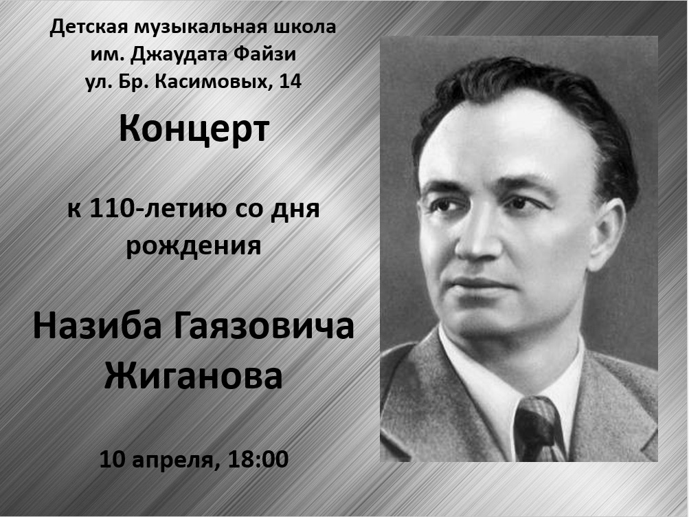 10.04 в 17.30 - на базе ДМШ имени Джаудата Файзи состоится КОНЦЕРТ, посвящённый творчеству Н.Г.Жиганова. В связи с особым санитарно-эпидемиологическим режимом, вход родителей на концерт ограничен: на один номер - один взрослый, наличие маски и бахил ОБЯЗАТЕЛЬНО! Афиша
