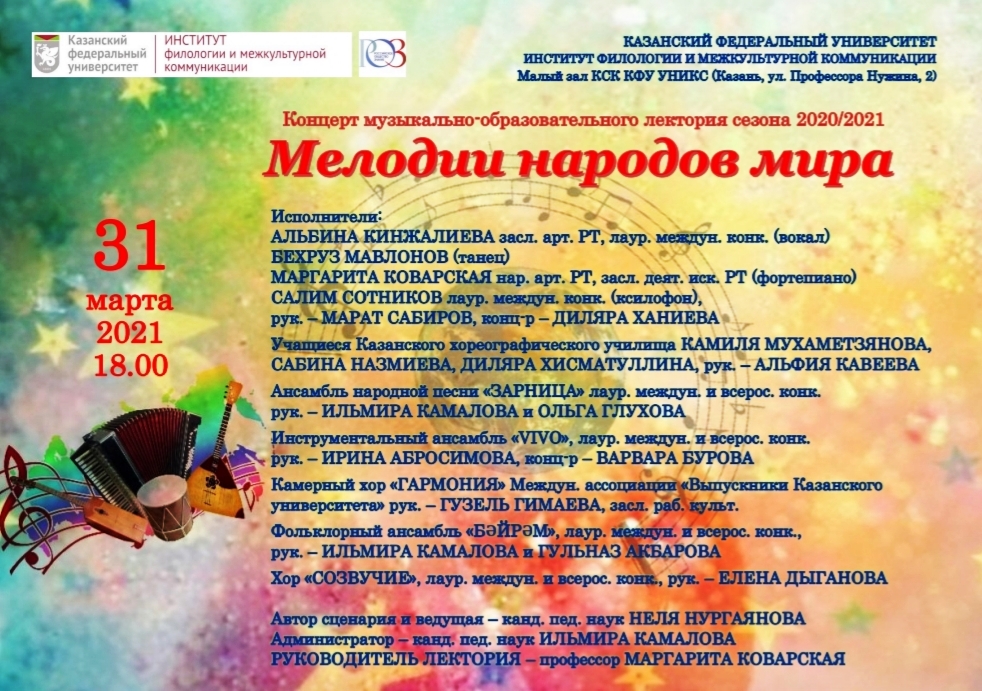 31 марта - выступление учащегося Сотникова Салима (ксилофон) в концерте музыкально-образовательного лектория сезона 2020/2021 "Мелодии народов Мира" на базе Казанского Федерального Университета/институт филологии и межкультурной коммуникации. Преподаватель: Сабиров М.К.; концертмейстер: Ханиева Д.И. Афиша