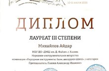 Поздравляем Михайлова Айдара с успешным выступлением на всероссийском конкурсе музыкально-инструментального исполнительства имени Айдара Салахова, который проходил в г. Елабуга и званием лауреата 3 степени.