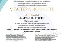 Исламов Сагит успешно выступил на IV Всероссийском конкурсе «Мастера искусств», став лауреатом III степени в номинации «Духовые и ударные инструменты. Смешанная группа».