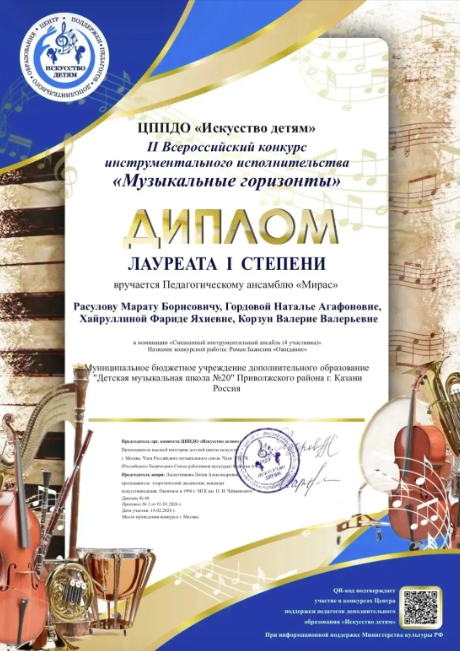 Поздравляем Педагогический ансамбль "Мирас" тв.площадки ДМШ №20 в СОШ 129 с Победой во II Всероссийском конкурсе инструментального исполнительства "Музыкальные горизонты"!