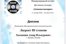 Хасаншин Амир - Лауреат III степени Международного онлайн фестиваля- конкурса "Снежная Мелодия", номинация "Инструментальное исполнительство", преподаватель Галлямова А.Б.