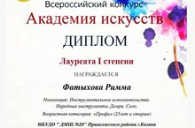 Победитель Всероссийского конкурса "Академия Искусств" - Лауреат 1 степени в номинации "Инструментальное исполнительство - Профи" - преподаватель отделения народных инструментов ДМШ20- Фатыхова Римма Ильясовна! Поздравляем!