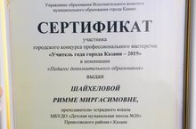 Поздравляем Шайхелову Римму Миргасимовну - обладателя Сертификата Участника Гоодского конкурса профессионального мастерства "Учитель года города Казани-2019" в номинации "Педагог дополнительного образования"