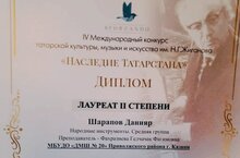 Победа выпускника школы, учащегося класса преподавателя Фахразиевой Гелчачак Фагимовны - Шарапова Данияра в IV Международном конкурсе Татарской культуры, музыки и искусства им.Н.Г.Жиганова "Наследие Татарстана"!!! Поздравляем!!!