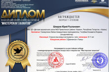 Поздравляем с достойной победой в Международном конкурсе искусства и творчества "Мастерская талантов" Лауреата 1 степени Шмарова Юрия Руслановича. Наставник: Галимуллина Лейсан Ахмадулловна (преподаватель) Голубева Елизавета Игоревна (концертмейстер)
