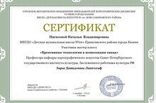 Пигасова Наталья Владимировна - Участник мастер класса "Креативные технологии в композиции танца" Профессора кафедры хореографического искусства Санкт-Петербургского государственного института культуры, Заслуженного работника культуры РФ Зары Давидовны Лянгольф.