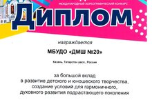 Дипломом за большой вклад в развитие детского и юношеского творчества, создание условий для гармоничного, духовного развития подрастающего поколения награждается Детская музыкальная школа №20 в Международном хореографическом конкурсе "Путь к успеху PRO-ДВИЖЕНИЕ".