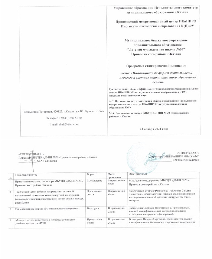 - Стажировочная площадка на тему «Инновационные формы деятельности педагога в системе дополнительного образования детей», Приволжский межрегиональный центр ПКиППРО Института психологии и образования К(П)ФУ, ДМШ №20, 23.11.2021 Программа