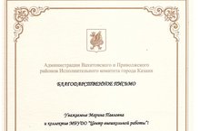 Поздравляем наш коллектив с получением Благодарственного письма Главы администрации Вахитовского и Приволжского районов г.Казани А.Н.Лобова