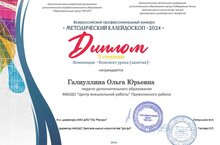 Всероссийский профессиональный конкурс "Методический калейдоскоп - 2024" педагог дополнительного образования Галиуллина Ольга Юрьевна получила диплом 3 степени в номинации: "Конспект урока (занятия)". Поздравляем и желаем дальнейших профессиональных успехов!