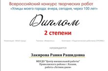 Педагог дополнительного образования Закирова Рания Рашидовна приняла участие во Всероссийском конкурсе «Улицы моего города: вчера, сегодня, через 100 лет» и заняла 2 место. Поздравляем и желаем новых побед!