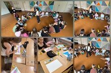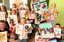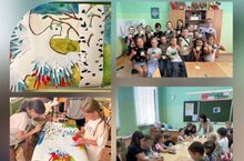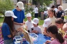 Очередное утро в пришкольном лагере началось с творческой мастерской под руководством Федуловой Д. Э. и Чураковой Д. А. Ребята выполняли аппликацию летних насекомых бабочки и жука в смешанной технике с использованием восковых мелков и цветных нитей для имитации узоров. На танцевальной площадке ребята вместе с педагогами Игуменовой А. С. и Каримовой Л. Ю. подвигались под музыку, изучая новый флешмоб и поиграли в игру на сплочение в отрядах.