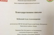 ГАОУ "Казанский педагогический колледж" выражает благодарность директору ДПЦ "Молодость" Кубасовой А.А. за сотрудничество в реализации Федерального проекта "Билет в будущее" в Республике Татарстан.