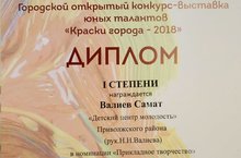 Подведены итоги Городского открытого конкурса-выставки юных талантов "Краски города - 2018". Воспитанник объединения "Студия дизайна "Палитра идей" (педагог Валиева Н.Н.) Валиев Самат в номинации "Прикладное творчество" удостоен Дипломом I степени. Поздравляем!